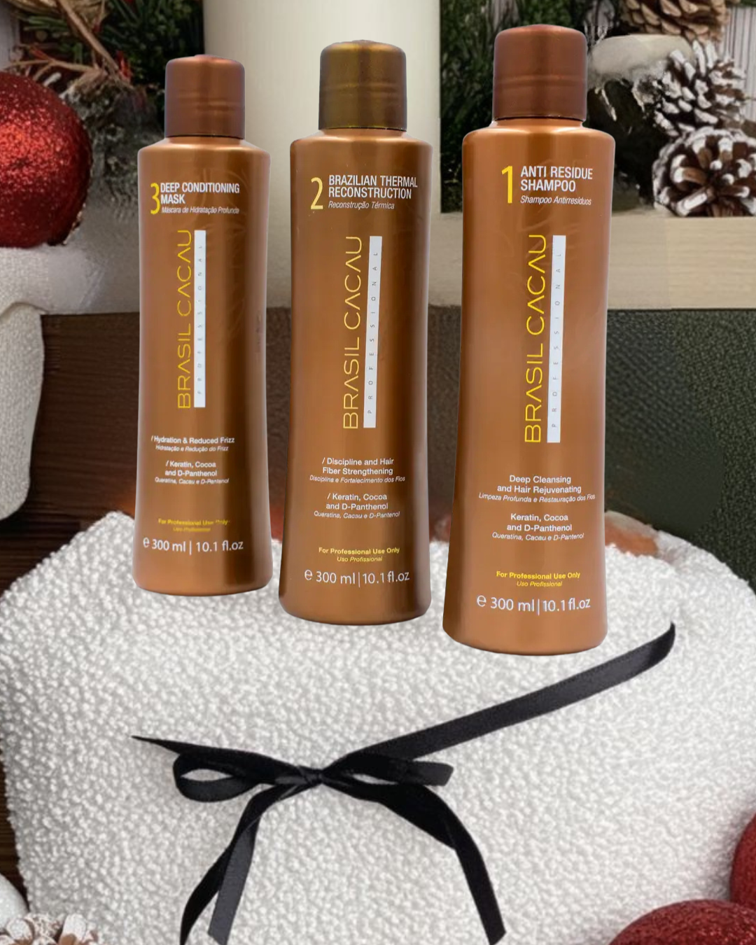 Transform your hair routine with our complete 3-step Brasil Cacau keratin system designed to smooth, repair, and protect.